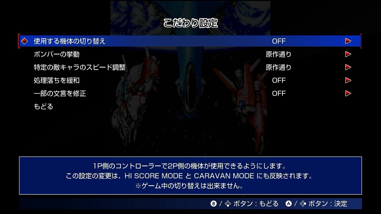 こだわり設定には自機の1P or 2Pの切り替え、他にもボンバーの挙動変更