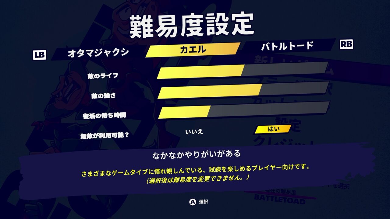 それなりのアクションスキルがあると自負しているので難易度設定はカエルでやっていきたいと思います。