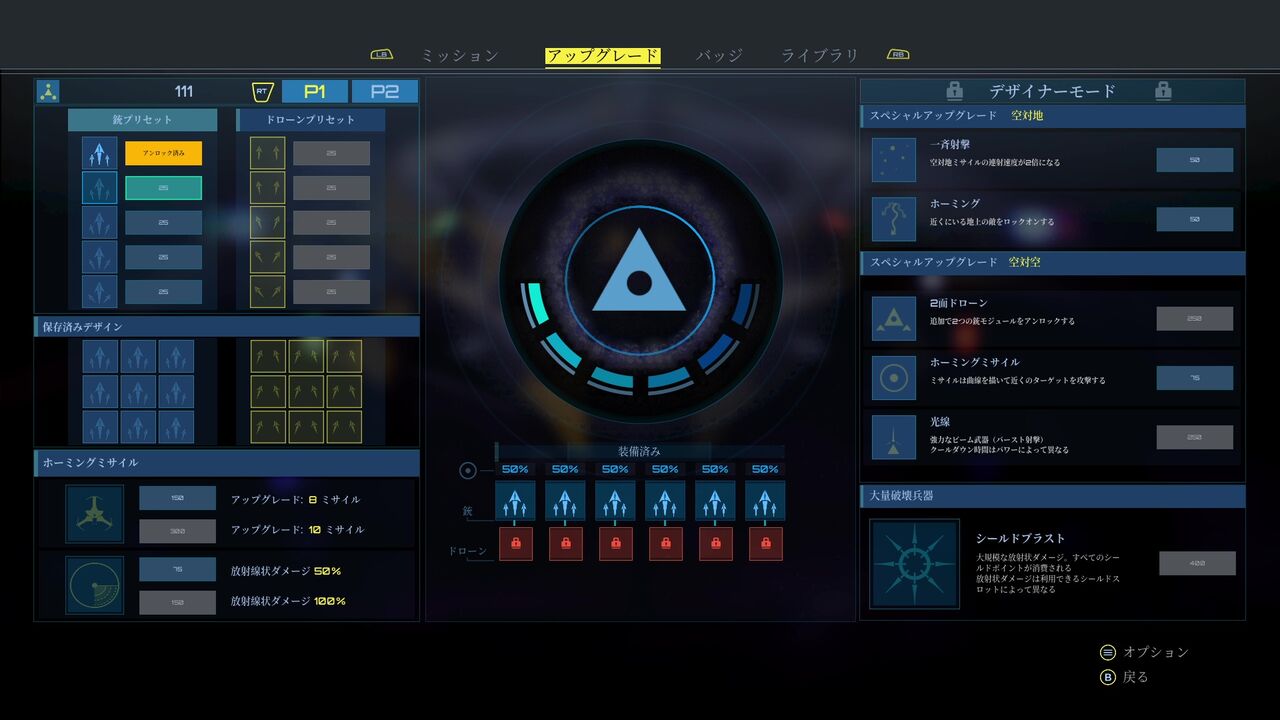 また、ステージクリア後に獲得したアイテムで自機をアップグレード出来る!