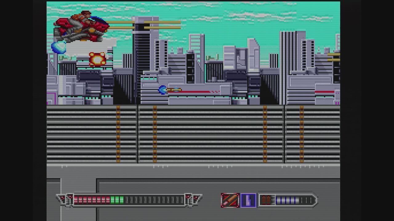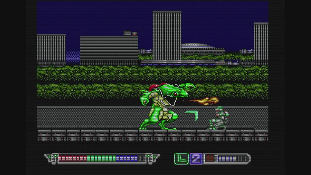 夕焼け空が印象的なステージ1…ワラワラと迫りくる雑魚敵…