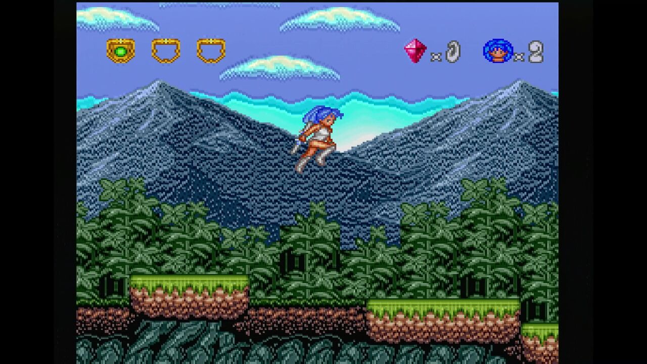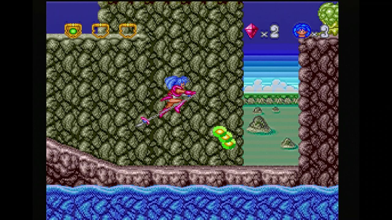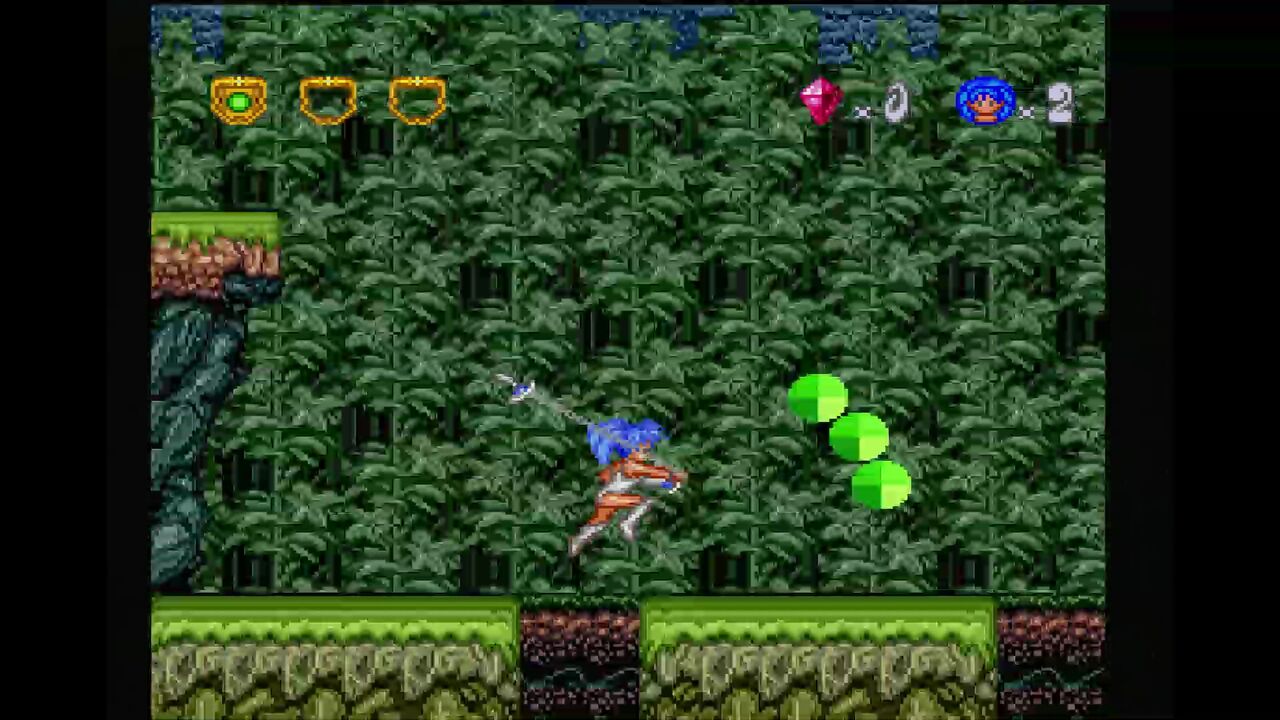 さらに、ジャンプ中に下ボタンと攻撃ボタンで二節棍を振り、広範囲に攻撃が出来ます。