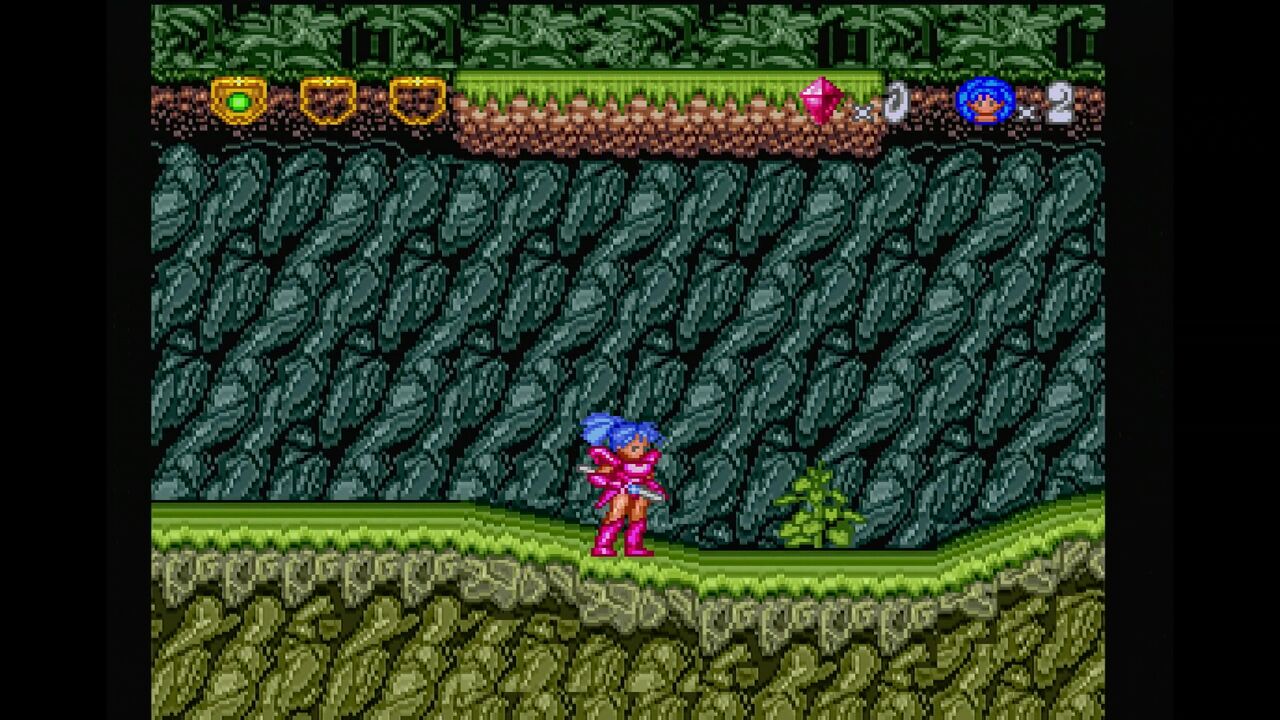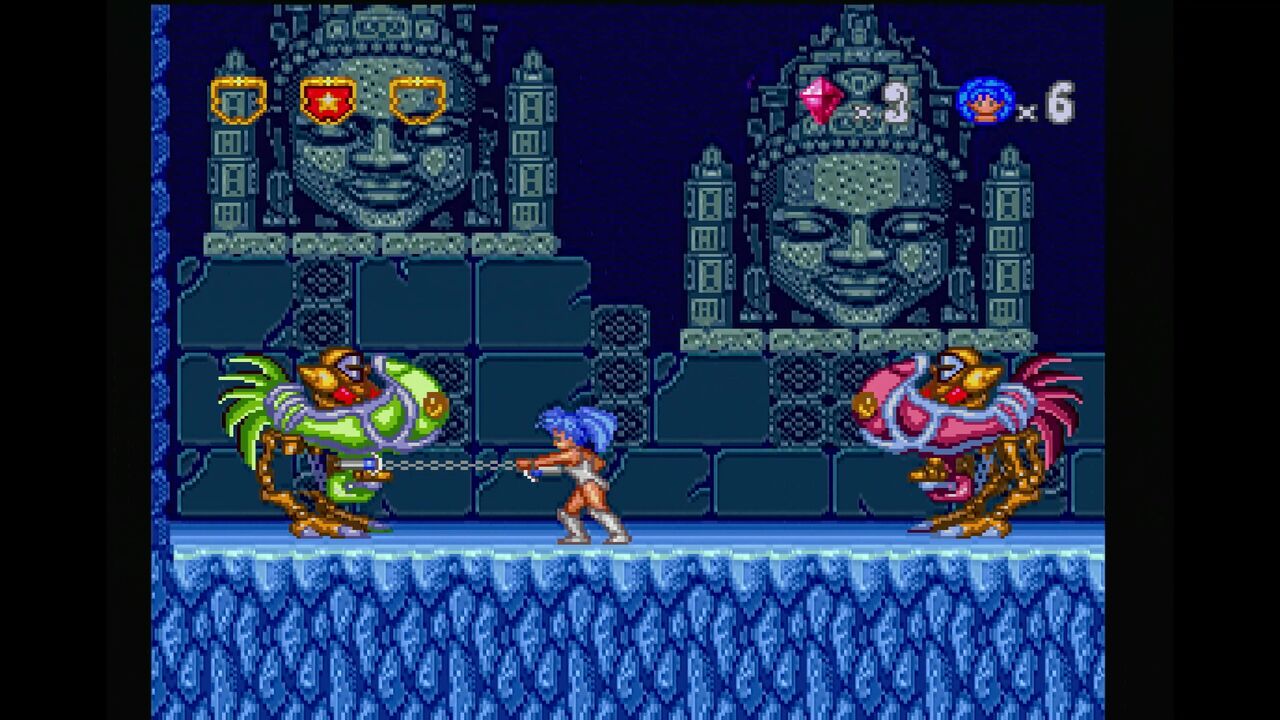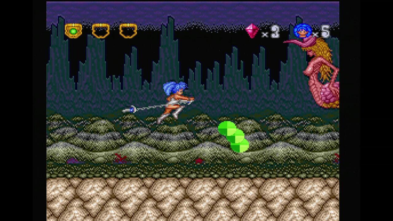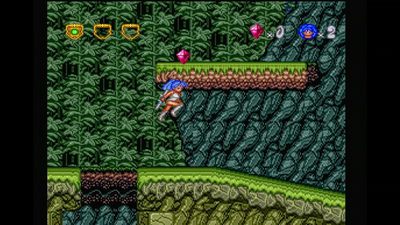 さらに、ジャンプ中に下ボタンと攻撃ボタンで二節棍を振り、広範囲に攻撃が出来ます。