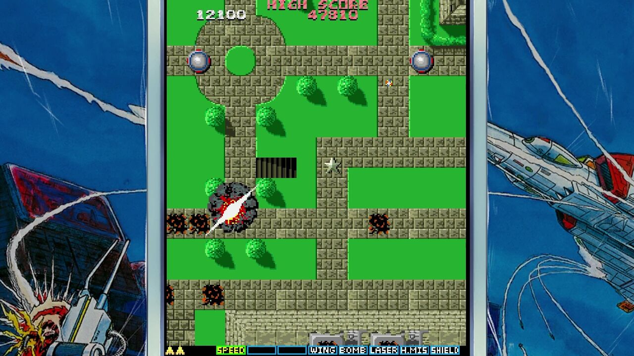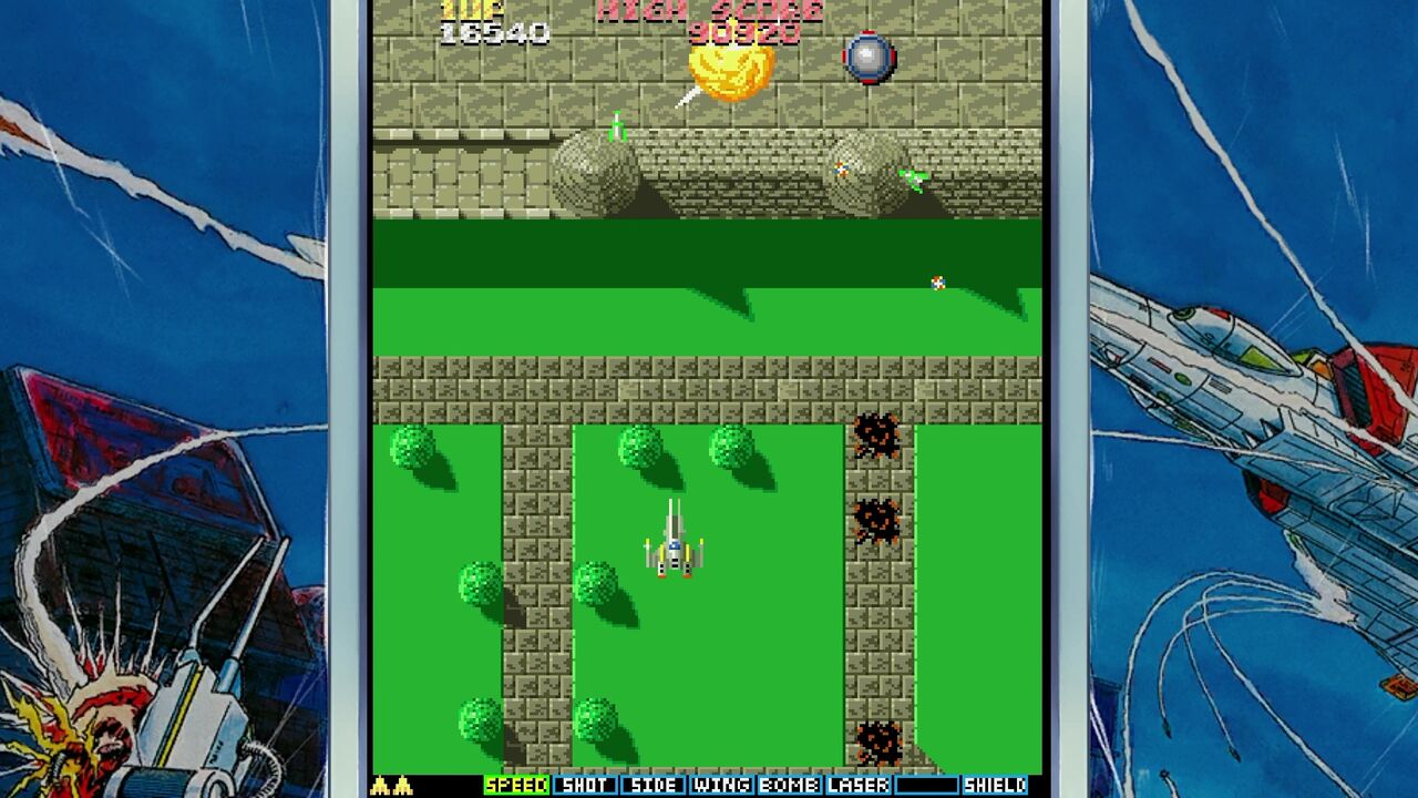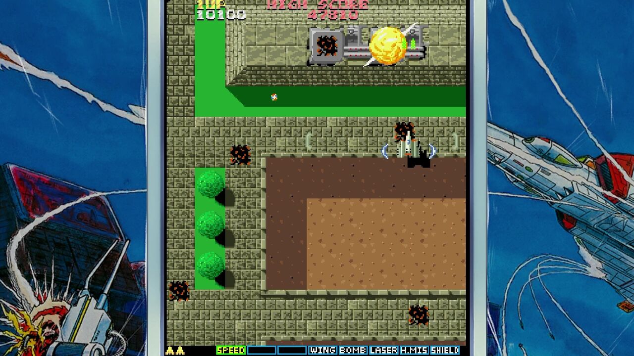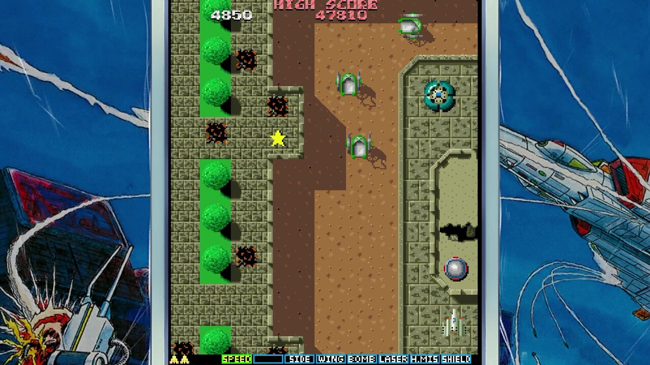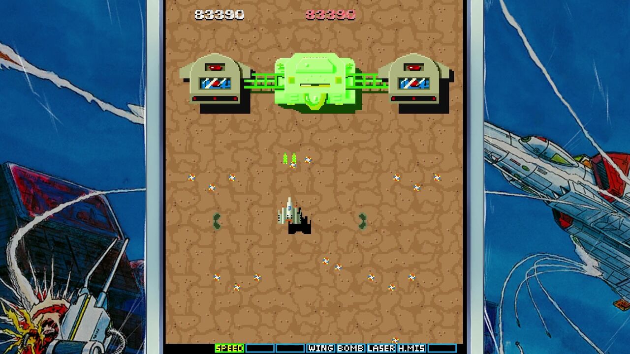 地上の敵を倒すと「E」マークのアイテムが手に入りショットがパワーアップ!