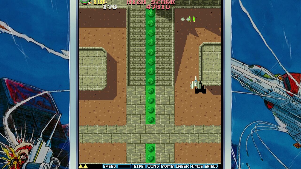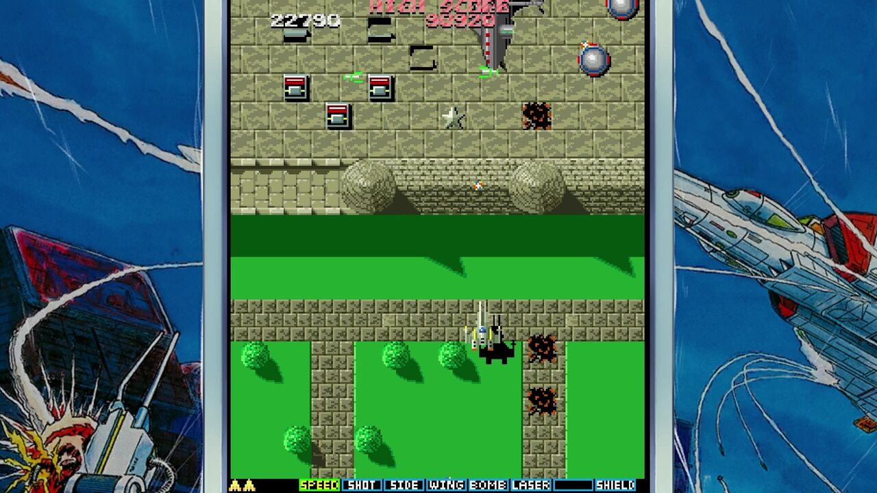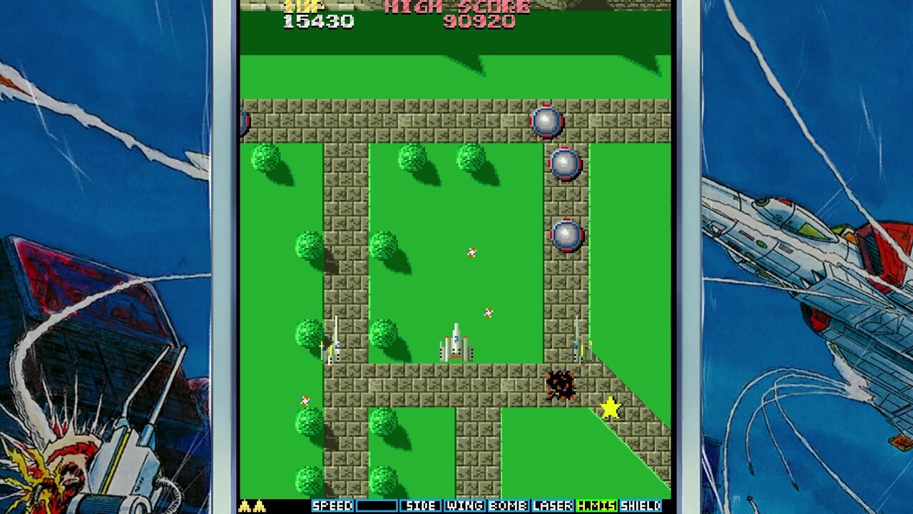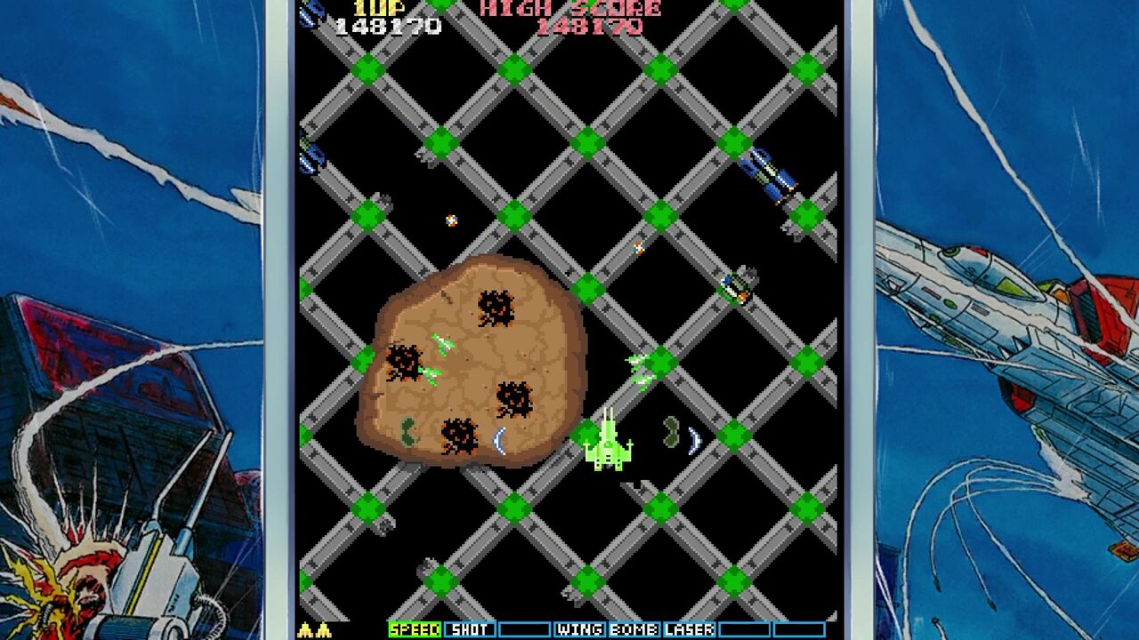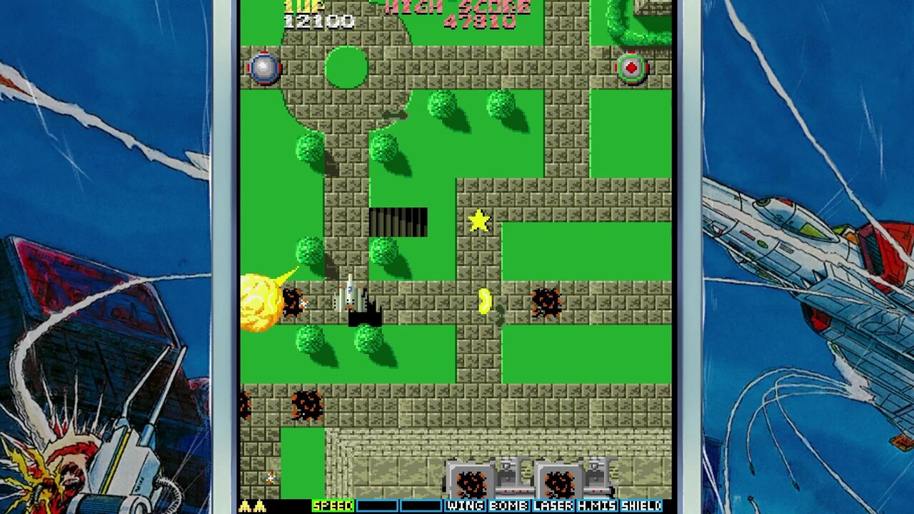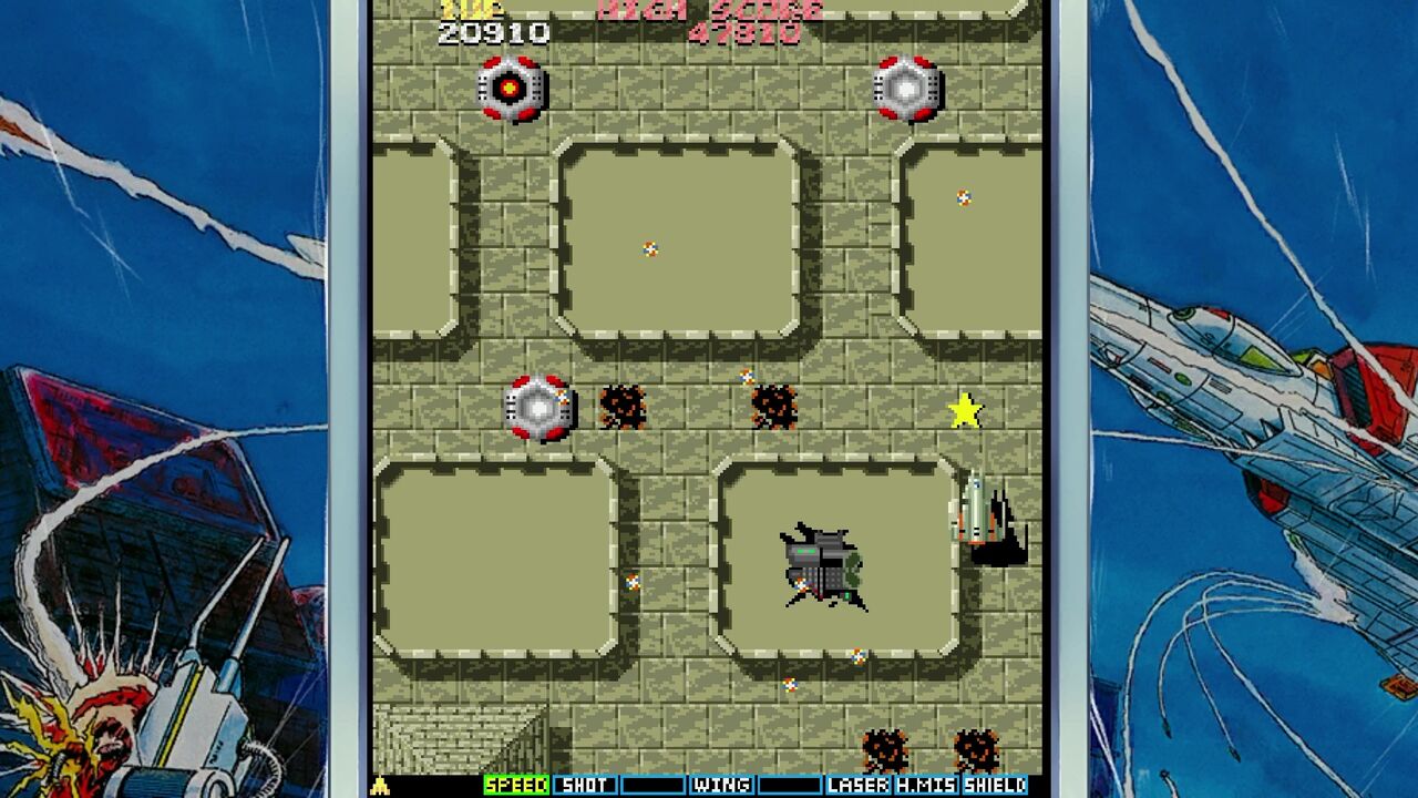地上の敵を倒すと「E」マークのアイテムが手に入りショットがパワーアップ!